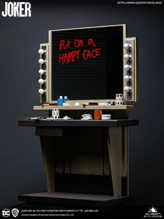 The Queen Studios team have carefully recreated one of the most iconic scenes from the 2019 Joker movie. As Arthur sits in his chair deep in thought. His legs crossed, one arm raised, who knows what twisted thoughts are running through his mind. No detail is spared, from his tailored clothing, to the bar of soap and brush on his dressing room table, and those immoral words inscribed on the mirror “Put on a HAPPY FACE”.