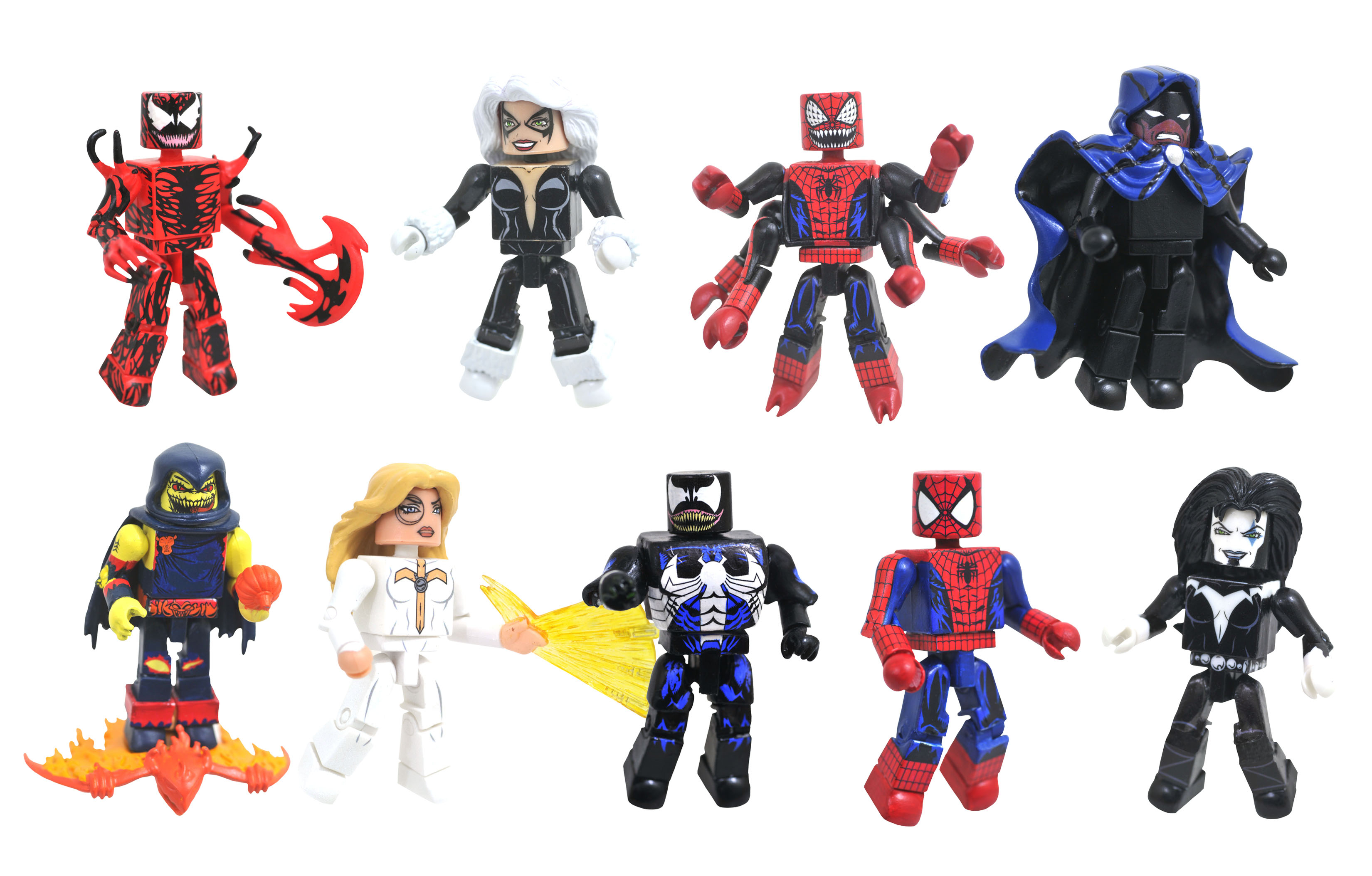 A Diamond Select Toys release! Let the carnage commence! Celebrating its 15th year. the Marvel Minimates line has dedicated its 76th assortment to the epic Spider-Man crossover. Maximum Carnage! Four specialty-exclusive 2-packs make up the assortment - Spider-Man with Black Cat. Venom with Doppelganger. Carnage with Demogoblin and Cloak with Dagger - and if you collect all four you get the pieces to build Shriek! Each 2-inch Minimates mini-figure features 14 points of articulation and fully interchangeable parts. Designed by Barry Bradfield.