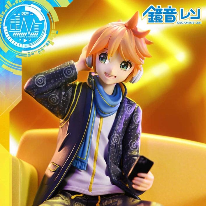 Lounging on a yellow sofa, fully immersed in his love for music—Len’s relaxed pose is faithfully captured from a cyberpunk-inspired illustration by the renowned artist.
