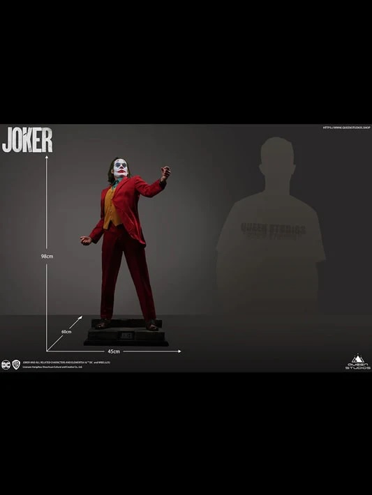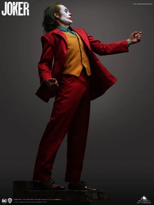 As Arthur becomes "Joker", he takes to the streets and dances his way to the late-night show "Live! With Murray Franklin". To further celebrate this transformation. Queen Studios' artist have chosen this staircase dance as the pose for the Joker 1:2 scale silicone statue. Fleck is stood mid-dance, lifting his left arm into the air, looking more contented than ever. Joker is wearing his now iconic royal red suit, goldbrick yellow waistcoat and a patterned blue shirt.