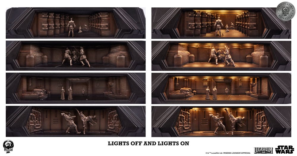 The Darth Maul 1:3 statue stands atop a pedestal style base decorated with four unique relief scenes with dramatic overhead LED lighting, each depicting important scenes from the classic STAR WARS: EPISODE I - THE PHANTOM MENACE.