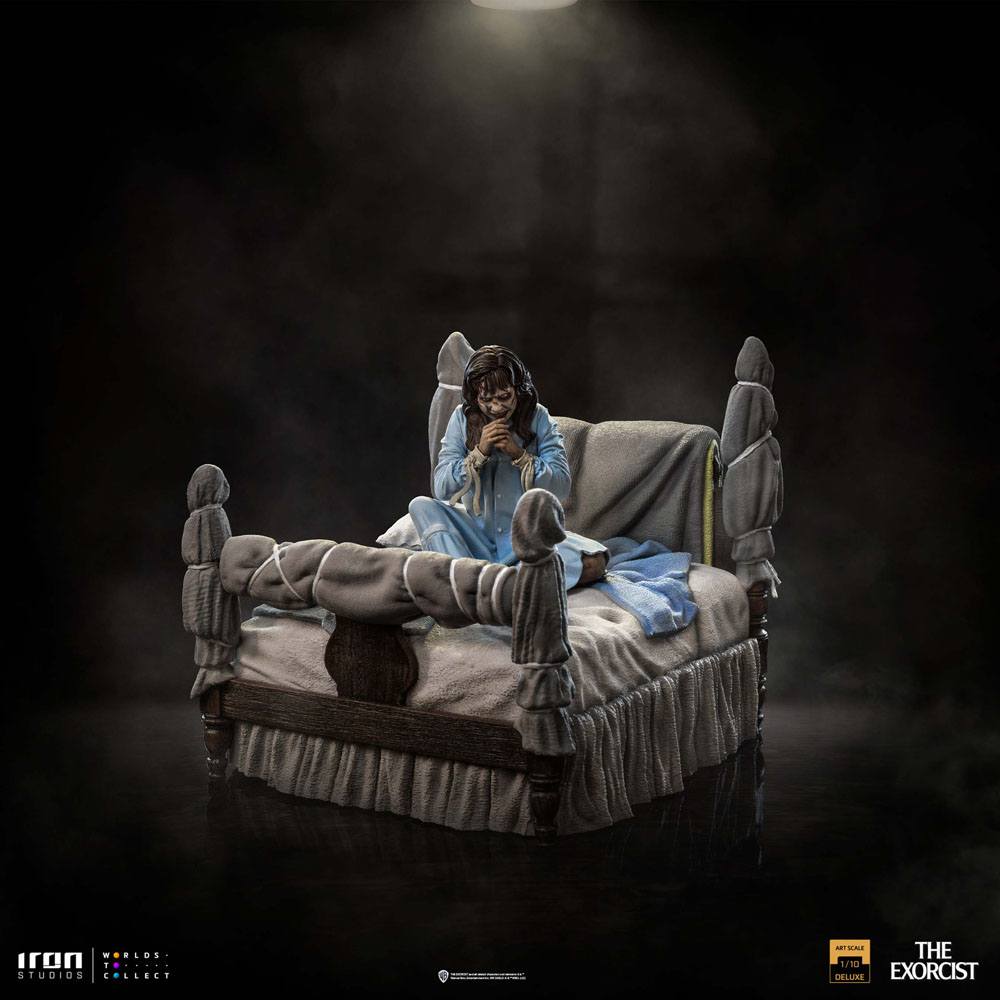 Trapped inside her room in a big house located in Georgetown, a historical neighborhood in the Northwest of Washington, in the U.S., over an old couple bed with padded headboard and footboard to protect its occupant, a demonic evil entity possesses the body of a preteen girl, turning her physically distorted with her body covered in wounds. Seating with a malicious and unhuman countenance, all that the diabolic spirit that lives in her body wishes for is to cause the death of its innocent host. Considered by many as the most terrifying movie of all times, Iron Studios present their statue "Possessed Regan McNeil Deluxe - The Exorcist - Art Scale 1/10", with the possessed protagonist from "The Exorcist", one of the greatest horror films ever done, celebrating its 50-year-anniversary of causing shivers of fear and horror in many generations.