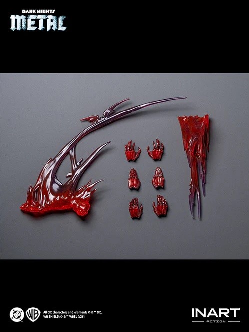 The design of the INART Action Batman: The Red Death Action Figure pays homage to the character's twisted origin with strong automotive influences across the design: Streamlined, glossy red armor shaped like a car's shell; a chest plate that looks to have been crushed and reformed, creating a distorted shaping with vehicular influences; as well as a back inspired by muscle-car vents and cooling systems. Subtle mechanical structures beneath the torso hint at a powerful internal engine within this speedster. Unstable Speed Force energy ripples through the Red Death's body, leaving only a trail of lightning and crimson bats behind.