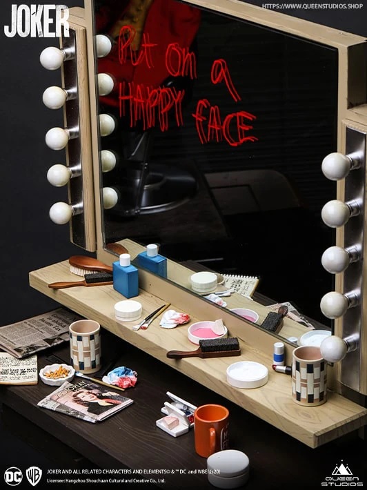 The Queen Studios team have carefully recreated one of the most iconic scenes from the 2019 Joker movie. As Arthur sits in his chair deep in thought. His legs crossed, one arm raised, who knows what twisted thoughts are running through his mind. No detail is spared, from his tailored clothing, to the bar of soap and brush on his dressing room table, and those immoral words inscribed on the mirror “Put on a HAPPY FACE”.