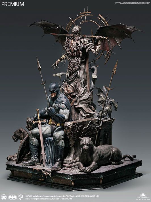 Inspired by Scott Snyder's Dark Knights Metal Cover, the Batman on Throne 1/4 scale statue by Queen Studios shows the Caped Crusader like you've never seen before! This Premium Edition includes two head sculpts and the Angel of Death standing behind.