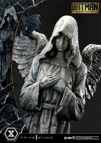 Standing atop the ruins of Gotham Cemetery, this 28-inch-tall Batman statue embodies the hero’s brooding presence and relentless spirit. Batman is captured in a powerful yet dynamic pose, his muscular physique meticulously sculpted to showcase every sinew and contour that defines his strength and agility. Ready to leap into action, his left fist grabs at his voluminous cape as it billows around him, its scalloped edge resembling bat wings caught in an unseen wind. The base features intricately crafted concrete blocks, weathered and worn, hinting at the passage of time. An angel statue looms behind the Caped Crusader, its serene yet somber presence adding a haunting beauty to the scene.