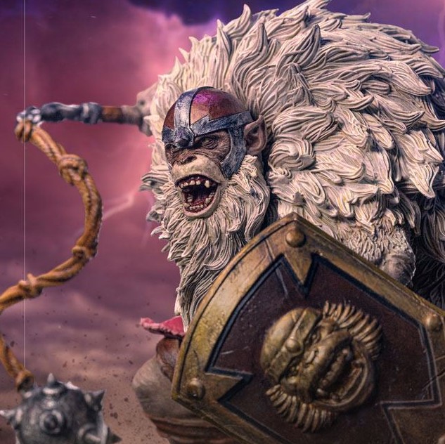 With thick white fur covering his neck and shoulders, a muscular ape-like figure of limited intellect leaps between boulders and rocks in the arid terrain of Third Earth, wielding his Morning Star Mace, a weapon he wields deftly. He protects his left flank with his shield, used for both defense and offense, capable of shooting projectiles. In this way, Iron Studios presents its "Monkian - BDS ThunderCats - Art Scale 1/10" statue with the clumsy monkey and general of the Mutants, a group formed by different races of animalistic humanoids, which are among the enemies of the ThunderCats.